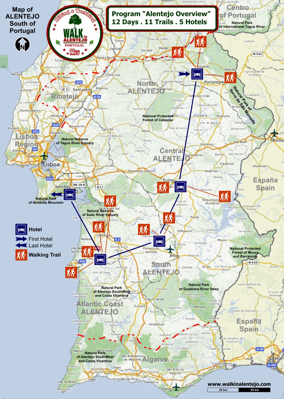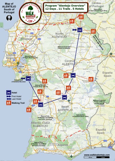 Walking Tour "Arribas do Tejo" - "Tagus River Banks" 16Km - Medium plus difficulty - Accessible to good walkers This is the part of the Alentejo region located to the north of the River Tagus. In mediaeval times, the area was defended by Belver Castle. These were the Lands of Guidintesta, given over to the Order of the Hospital, which built a replica of Jerusalem’s Belvoir Fortress here. The river marks a trail through nature teeming with life; here, too, are megalithic remains, historical defensive structures, ancient but now submerged river and sulphurous spas, and a huge, dammed reflecting pool, bounded by a romantic walkway. |