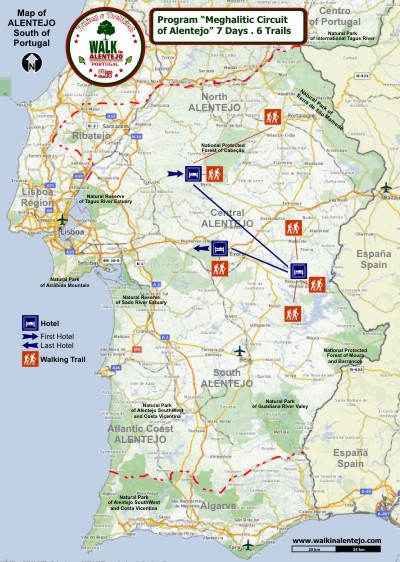 Walking Tour "Cromeleque dos Almendres e Anta Grande do Zambujeiro" - "Almendres Cromelech and Zambujeiro Big Dolmen" 20Km - Medium plus difficulty - Accessible to good walkers This Central Alentejo, very close from Évora, was the birthplace of so many civilizations. Here we find the vestiges of distant past that refer us to prehistory where we can find what is considered the oldest monument of humanity and the largest dolmen of Portugal, where our ancestors bade farewell to their dead in so different cults of our days. In the middle of the montado woods we find the perfect cross between the history and the myth where remains medieval castles from past heroes of the Christian reconquest from Évora to the Moors. Hotels